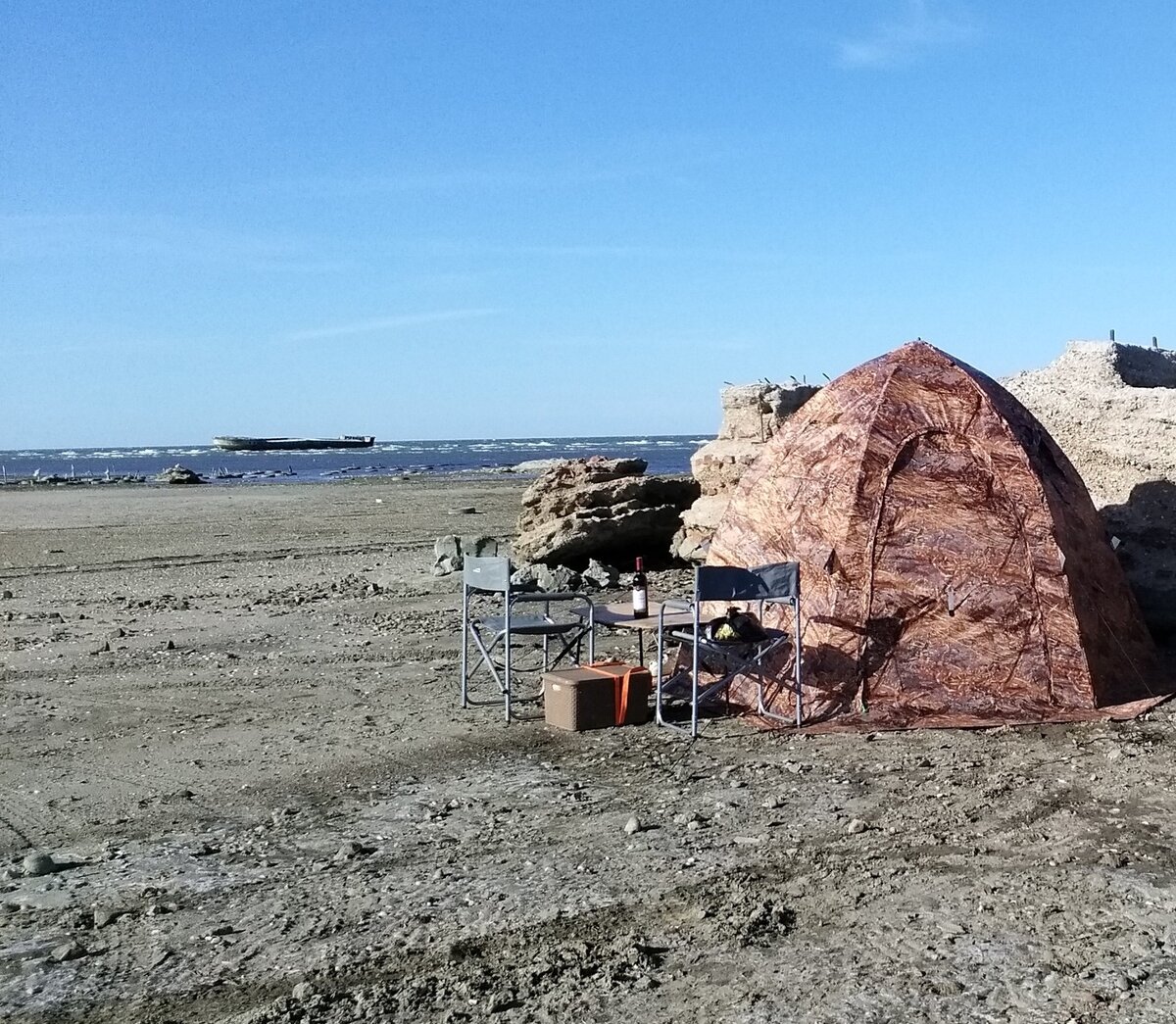 Полистав страницы всемирной паутины, прочитав отзывы о местах отдыха на берегу, мы решили, что Крайновка для нас - то, что доктор прописал. Потому оттуда и Астрахань - рукой подать. Добрались мы в Крайновку, спросили у местного населения, где тут можно бросить кости, а также палатку, машину и двух собак. Гостеприимные дагестанцы нам предложили на выбор весь берег. Проехав по дороге вдоль туда-обратно, мы выбрали место, где можно спрятаться от ветра, так как нас предупредили: погодка нарисовывается не очень. Море было сурово и совсем не походило на то, что встретило нас дня три назад под Дербентом. Это, скорее, Баренцево. Или Балтика. Хотелось исполнить песню варяжского гостя: " Из стен тех каменных у нас, варягов, коооости......" Ветер мешал, просто сбивал с ног, ронял мебель и пытался унести с собой бутылочку с таким тру