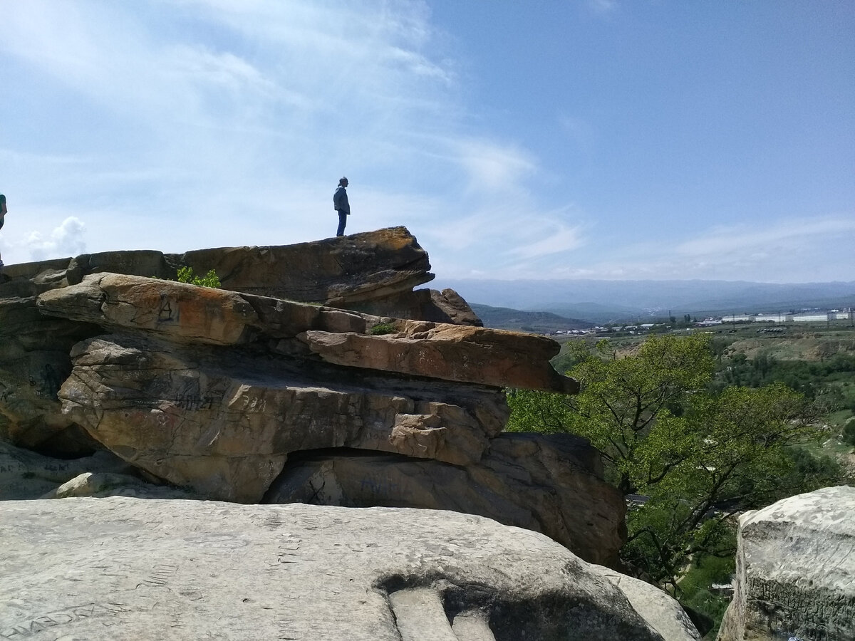 Залезть залез, а как будет спускаться, не подумал. Сущий ребенок, даже собаки удивились его смелости, они вот не полезли на самый верх. Вообще скала раньше называлась Тамерлан-скала, потому что на ней стоял шатер завоевателя, откуда он отправлял карательные операции в горы Дагестана. Теперь же её называют Кавалер-Батарея, и это визитная карточка Буйнакска. Место довольно колоритное. Будет по пути- потратьте немного времени, загляните сюда (42.8287000 47.1134900). В нашем роуд-буке было написано еще про то, что у основания скалы можно разглядеть картину первобытного художника, как стадо оленей убегает от охотника. Сохранилось лишь стадо оленей, охотник почти не видим. Но для нас невидимой оказалась и сама картина. Нужно было искать основание, а мы еле спустились по скользкой скале и так и не