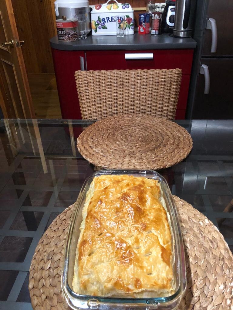 Я посадила в этом сезоне очень много салата разных сортов. Едим свежий салат каждый день, а его количество на грядках не уменьшается. В заготовленном на зиму виде салат невкусный ( я пробовала все виды заготовки), вот я и решила попробовать положить салат в пирог. Нам пирог очень понравился! Ингредиенты: Тесто слоеное бездрожжевое покупное - 1 упаковка (2 пластинки) Яйца куриные - 3 шт Сыр моцарелла ( или сулугуни, или брынза, или творог, или любой сыр) - 200 гр Укроп- 1 пучок Лук зеленый - 1 пучок Салат - 1 пучок Кинза - 1 пучок Петрушка - 1 пучок Чеснок - по вкусу ( можно свежий, можно сухой) Соль - по вкусу Перец красный сладкий - по вкусу Масло подсолнечное без запаха - 2 чайных ложки Приготовление: 1. Разморозить и раскатать обе пластинки теста под размер вашей формы для выпечки. 2. Смазать форму для выпечки подсолнечным маслом и выложить на нее пластинку теста. 3. Приготовить начинку: измельчить зелень, залить её яйцами, оставив часть одного яйца для смазывания пирога, натерет