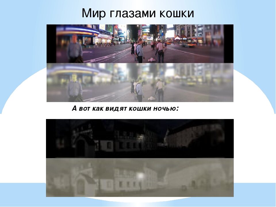 Многие животные видят мир в нечетких оттенках серого или в размытых и бледных цветах, другие же могут видеть в полной темноте и даже видеть те цвета, которые находятся за пределами видимого человеком спектра. Зрение котов и кошек устроено таким образом, что они детально и в мельчайших подробностях способны рассмотреть предмет, который расположен от них на достаточном отдалении (не менее полуметра), а вот все, что находится вблизи, кошки видят значительно хуже, размыто. Кошки – дальнозоркие существа (в отличие, кстати, от собак, которые близоруки); Движущиеся предметы собаки видят лучше, чем недвижимые. Они способны заметить перемещающийся объект на расстоянии до 900 м, а вот неподвижный – только до 600. Псы не смотрят телепередачи, так как частота чередования кадров у телевизора всего 50-60 герц, тогда как питомцу нужно 80 герц.