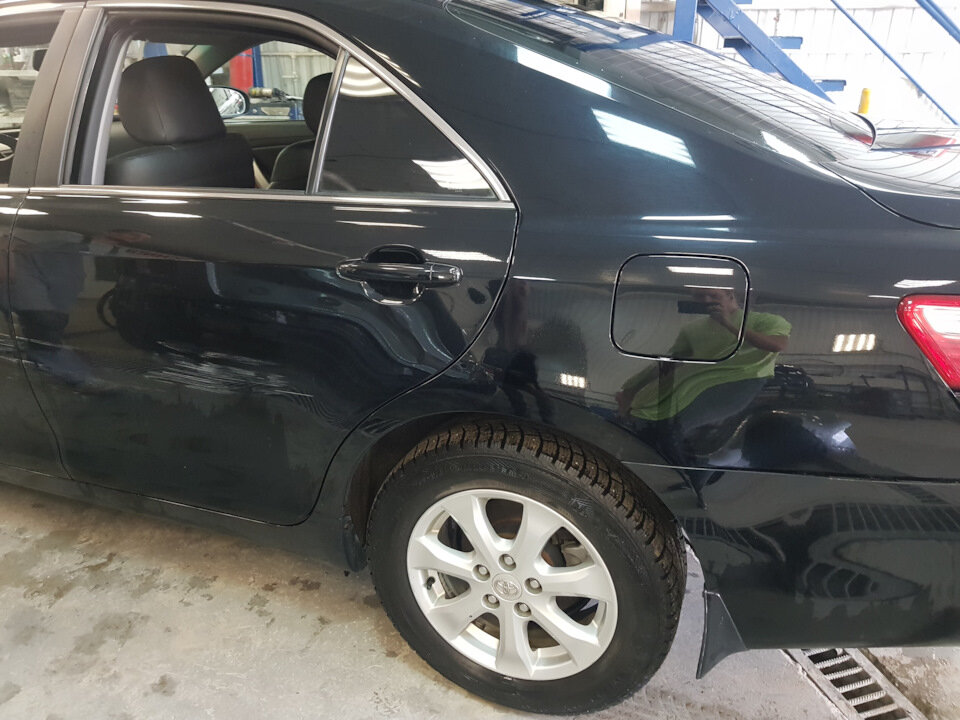 К нам на кузовной ремонт привезли авто Тойота Камри черного цвета с повреждениями левого переднего и заднего крыльев (вмятина и царапина), левой передней и задней дверей (глубокие царапины).