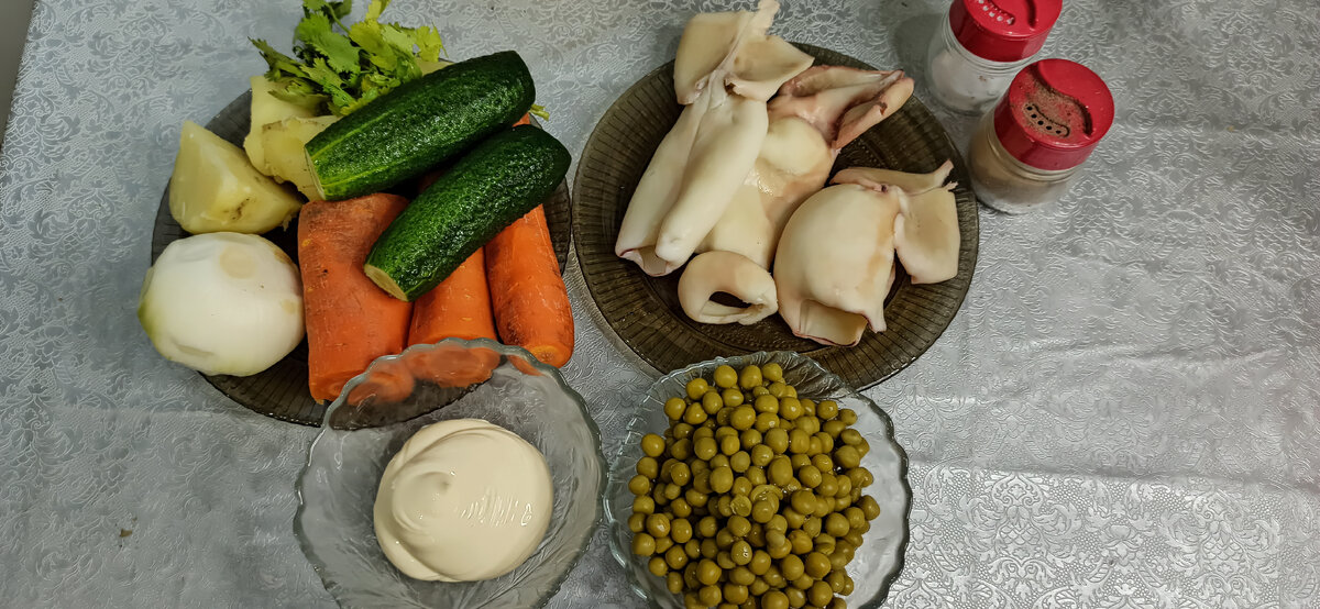 Это лучшее оливье,что я пробовал!Теперь и я готовлю только так! Нам понадобится: Кальмары — 600 грамм: Картофель — 2 — 3 штуки; Морковь — 1 штука; Консервированный горошек — 1 банка; Лук-1 гол; Майонез — 3 — 4 столовые ложки; Соль, перец — по вкусу. Огурец свежий (маринованный)-2 шт Приготовление: Морковь и картофель отвариваем в подсоленной воде.Кальмары чистим и примерно 2 минуты варим в кипятке.Больше не нужно,иначе они будут жесткими. Режем все мелкими кубиками.Кальмары полукольцами.Все ингредиенты соединяем, добавляем горошек,зелень, соль, майонез. Салат выкладываем на блюдо, украшаем зеленью. Если Вам понравится рецепт, Вы можете поставить ❤ и подписаться на канал.Еще больше рецептов на моём Ютуб канале https://www.youtube.com/channel/UCSQ0MLtfcGdLNraZmpJfH2w