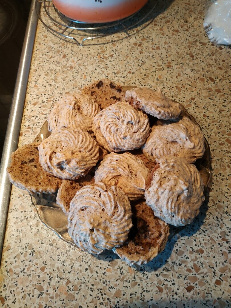 Моя работа неразрывно связана с умственным трудом, а чтобы мозг нормально работал - нужно что-нибудь сладенькое. Сегодня я вам расскажу простейший рецепт печенья с грецким орехом, который поможет вам начать ваш день. Первым делом нам нужно перемолоть в блендере 120 грамм грецких орехов. Затем мелко наломать 80 граммов горького шоколада. Горькость около 72,5%, больше не надо. Касаемо крема, всё просто и тривиально: 100 грамм яичного белка + 100 грамм сахара. Взбивать миксером 5 минут до однородной консистенции. Теперь нам нужно добавить орехово-шоколадную смесь в крем и перемешать обычным венчиком. Без фанатизма, буквально 5-6 движений. Перекладываем нашу смесь в кондитерский мешок. И выкладываем наши печенюхи на силиконовый коврик. Форма может быть вообще любая, для себя же готовим. Но, если кто хочет заморочиться - право ваше. Я лишь разогреваю духовку до 170 градусов Цельсия, и ставлю в них печеньки на 15 минут. Потом даём им 10 минут на стабилизацию... И готово. Отличное лакомство д