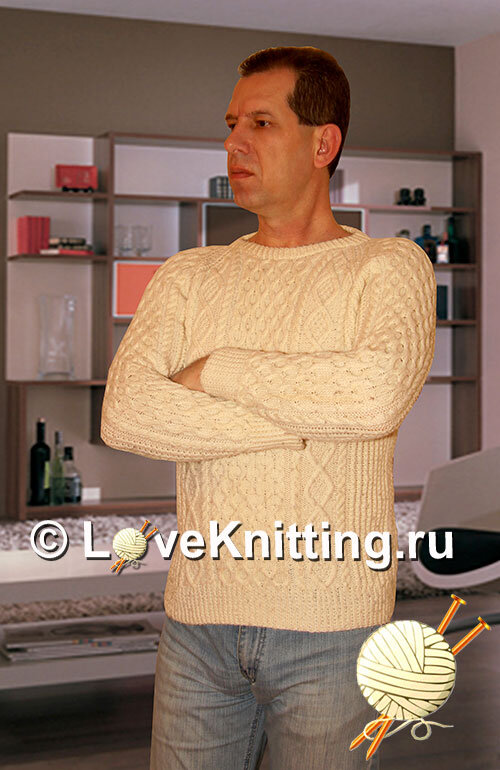 Светлая, с объемным узором модель пуловера на весну займет достойное место в гардеробе вашего мужчины. Размер: XL ВАМ ПОНАДОБИТСЯ УЗОРЫ Скрещенная резинка 1 х 1: см. Азы; Изнаночная гладь: лиц. р. – изн. п., изн. р. – лиц. п.; Жемчужный узор: 1-й р.: попеременно 1 лиц. п., 1 изн. п.; 2-й р.: вязать по узору; 3-й р.: попеременно 1 изн. п., 1 лиц .п. (над лиц. п. предыдущего р. вязать изнаночными, над изн. п. – лицевыми); 4-й р.: вязать по узору. Повторять 1-4-й р. Узор 1: вязать по схеме 1, в изн. р. вязать по рисунку. Повторять 1-4-й р.; Узор «косы плюс» (26 п.): вязать по схеме 2, в изн. р. вязать по рисунку. Повторять 1-20-й р. Узор «соты» (8 п.): вязать по схеме 3, в изн. р. петли вязать изнаночными. Повторять 1-12-й р. Особые убавления: справа: кром. п., 2 лиц. п., перекрещ. направо (вязать лицевой 2-ю п. с левой спицы перед 1-й петлей, потом, не снимая ее со спицы, вязать лицевой 1-ю п. и снять со спицы обе петли), изн. п., 2 п. вместе с наклоном влево (см. Азы); слева: 2 п. вме