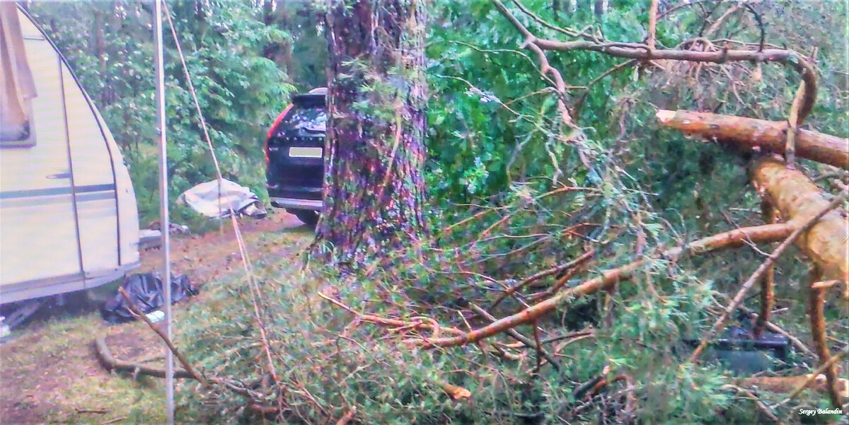 А ветер все усиливался. Дождь шел буквально горизонтально. Но мы на него уже не обращали внимания. Через шум ветра и дождя было слышно как закряхтел, упираясь, лес. Первой сломалась огромная ветка на стоящей справа рядом большущей сосне и с грохотом упала рядом с прицепом-дачей. Только проводил ее взглядом, как в том же направлении метрах в тридцати рухнула большая сосна. Все это я видел прекрасно. Через минуту раздался ужасный треск над головой. Это сломалась здоровенная верхушка у сосны, стоящей слева рядом. Резко поднимаю голову и вижу как острием вниз падает эта верхушка. Длина ее метров семь. Она втыкается в землю в трех метрах от стоящей чуть в сторонке машины, под собственной тяжестью и напором ветра ломается где-то на уровне метра над землей и падает вдоль маркизы рядом со мной. Реально видя все это понимаешь, что сделать ничего не успеешь. Отпрыгнуть не успеешь, а спрятаться вообще негде. В лесу может рухнуть абсолютно любое дерево.