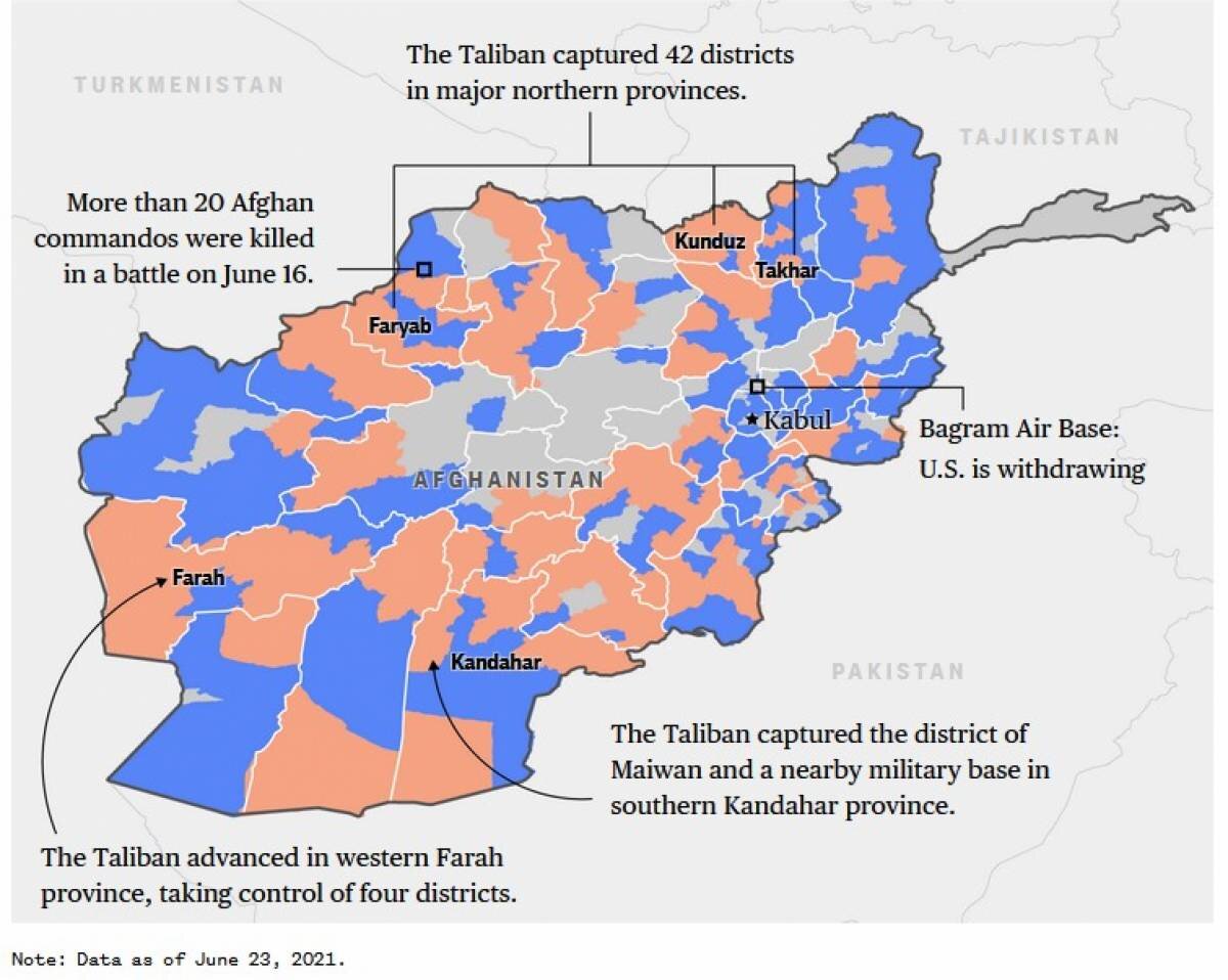 1. 20-леняяя война США в Афганистане заканчивается пшиком. В последние недели на фоне вывода американских войск из Афганистана движение Талибан [признано террористической организацией в ООН и России] постепенно возвращает над территорией страны контроль, утраченный после американского вторжения 2001 года. Разобраться в афганской ситуации довольно непросто: кто именно держит власть во множестве спорных районов, совершенно непонятно. По некоторым данным, талибы уже контролируют до 70% Афганистана (на заглавной карте они показаны красным цветом, спорные территории – серым, правительственные – синим).