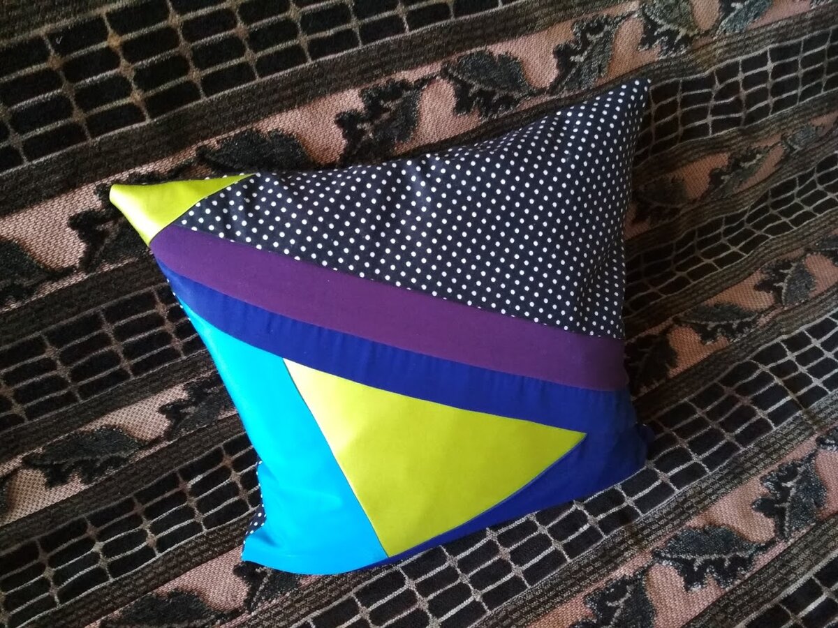 На просторах интернета несколько лет назад увидела фотографию необычной лоскутной подушки. Посмотрела. Облизнулась и до поры забыла. Как - то сын попросил сшить ему подушку в машину. Долго перебирала варианты. Вспомнила про фото подушки и решила сейчас или никогда. Подобрала ткани. Для того чтобы быть уверенной, что цвета подобраны наилучшим образом делаю несколько фотографий с различными комбинациями лоскутков. Потом через несколько часов пересматриваю снимки, удаляю самые неподходящие. Если по-прежнему не могу определиться, то через несколько часов вновь произвожу отбор наиболее удачного сочетания. После того как разутюжу ткань, приступаю к раскрою. Чем мне нравится лоскутное шитье, всегда можно внести свои дополнения в дизайн. Когда все части подушки были раскроены, я сложила на столе все детали, чтобы увидеть, какая подушка получается, вроде все понравилось. Решила еще раз сфотографировать. Снимок позволяет взглянуть на процесс как бы со стороны. Картинка показала, что подушка пол