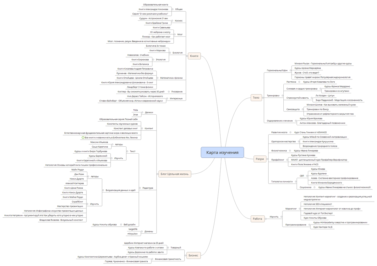 Чищу свой архив от не нужных файлов и вот что нашел. Это очередная карта изучения, которую я составил до ухода в армию. Нечто подобное я уже выкладывал. Делюсь, вдруг кому-то пригодится. Многое не актуально, ведь это небольшой слепок моих планов трехгодичной давности. Кстати, процентов 70% из списка я изучил, внедрил правда всего процентов 50%. Остальная часть либо не актуальна, либо появились более нужные и актуальные темы. Приятно находить такое. Не раз мне чудилось, будто я стою на месте. Не развиваюсь, ничего не изучаю и не двигаюсь вперед. Но когда собственными глазами видишь такой список тренингов, кажется, что тут информации навалом и никогда не изучить ее. Я уж молчу о внедрении. Мол что за монстр это все осилит, да и нафига это все ему? Пусть расслабится, кайфанет, но нет. Это нужно только тем, у кого есть цели и они с переменных успехом идут к ним. Забавно смотреть с чего все начиналось, например, в бизнесе. Ведь большинство материалов я перерос. Теперь никаких Ковпаков и в п