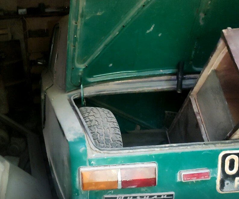 Копейка (ВАЗ 2101) 1971 года, в этом году ей исполнилось 50 лет, в 1997 году её поставили в гараж в связи с покупкой ВАЗ 2106, так она простояла 24 года. Автомобиль покрылся толстым слоем пыли, которую никто не вытирал все это время. Первым делом начали качать колёса, подогнать автомобиль с компрессором не было возможности, поэтому качали ручным автомобильным насосом, занятие не самое приятное и не самое быстрое, но все колеса были накачены, за 24 года с камерами ничего не случилось. Три колеса накачались без проблем, у одного были проблемы с ниппелем, его скрутили с другой камеры, которая лежала в гараже и колесо накачалось. Автомобиль было весьма непросто вытолкать из гаража, на нём лежало много вещей, ворота не открывались всё это время, а по периметру лежало куча всего, но общими усилиями мы справились и автомобиль стоял на улице. Сразу стало видео огромный слой пыли на автомобиле. Салон у автомобиля красного цвета, на полу лежат самодельные коврики из плотного материала, похожего
