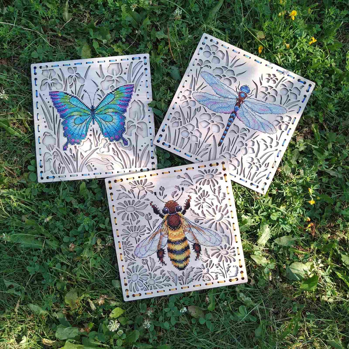 Я вышила несколько деревянных заготовок. В этом посте хочу показать серию от М.П. студии. Я влюбилась в пчелку, но покупать ее одну было как-то не интересно, все-таки в серии такие работы смотрятся эффектней!