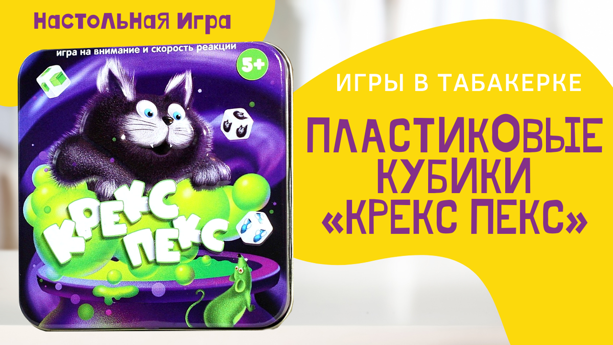 Динамичная игра «Крекс пекс» – это весёлое соревнование, в котором детям предстоит проявить скорость реакции и разобраться с цветовыми художествами колдовского кота Буси. Состав: • пластиковые кубики – 5 шт. (2 х 2 см)