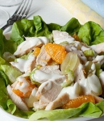 ИНГРЕДИЕНТЫ Салат айсберг 1 головка Стебель сельдерея 1 стебель Апельсины 1 штука Виноград 150 г Натуральный йогурт 4 столовые ложки Жидкий мед 1 чайная ложка Соль по вкусу Дижонская горчица 1 чайная ложка Свежемолотый черный перец по вкусу Куриное филе 1 штука ИНСТРУКЦИЯ ПРИГОТОВЛЕНИЯ 1. Куриное филе разрезать пополам и обжарить на подсолнечном масле. Оставить остывать. 2. Дольки апельсина очистить от прожилок, нарезать кубиками. Виноградины разрезать вдоль пополам. 3. Стебель сельдерея мелко нарубить. 4. Куриное филе нарезать кубиками. Все смешать. 5. Для заправки смешать йогурт, мед, горчицу, присолить, поперчить. 6. Порвать листья айсберга и выложить на порционную тарелку. Сверху выложить смесь и заправить. Понравился рецепт — поделитесь им с друзьями в социальных сетях! Готовьте вместе с «Едой»!