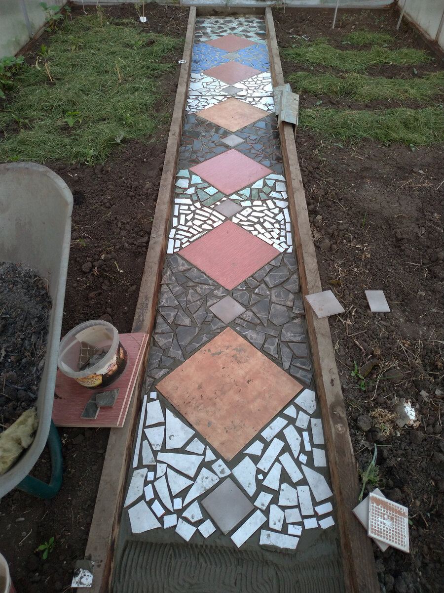 Этот год у меня посадки в огороде припозднились из-за болезни. А теплица вообще осталась практически пустая. Ну и пусть отдохнет, решила я. А тут ещё и погодка просто волшебная: то холод, то дождь. Спряталась в теплице, оглянулась вокруг... О! Я знаю что мне надо!!! После ремонта остались обрезки и осколки кафеля. Сильно крупные разбила молотком, завернув в тряпку, чтобы не разлетались осколки. Несколько плиток целой напольной плитки очень кстати. И закипела работа. У меня ушли почти все осколки. Нашла в закромах ещё один цвет. Небольшое неудобство - разная толщина плиток. Но для такого объема работы в одном хозяйстве столько осколков найти проблема. Жалко, что я не художник, а то можно было бы картину выложить. Хотя мне даже так понравилось. Осталось совсем чуть-чуть. Собираю материал для завершения. А пока затерла швы. Ну вот как-то так получается. Затирка для швов практически всегда остаётся в большом количестве. Дома несколько пачек разного цвета. Думаю, что было бы очень интере
