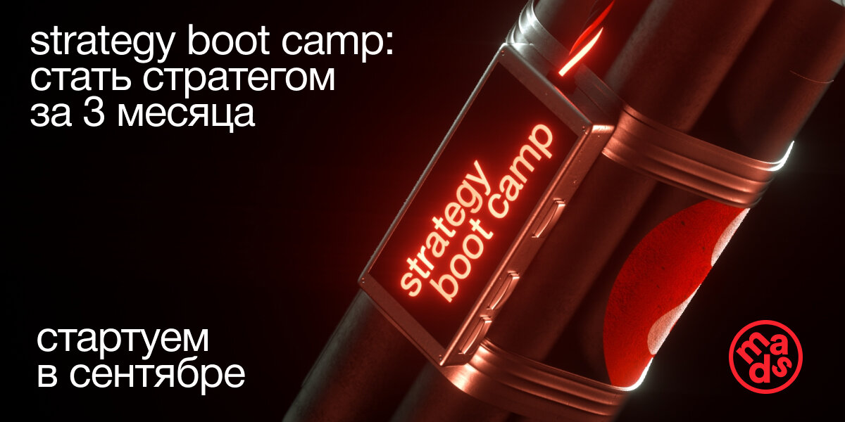 В индустрии не хватает стратегов, но как таким стать? Читать книжки и слушать лекции не вариант — надо подкреплять практикой. Разбирать реальные брифы, решать насущные проблемы брендов. На курсе strategy boot camp в mads мы за три месяца научим тебя мыслить и действовать как топовый стратег в креативном агентстве. В кэмп возьмем всех — от стратегов-профи, которые хотят качественно выстраивать рабочий процесс, до джунов, что только мечтают работать над кампаниями, о которых будут говорить все. Делаем мы это по двум причинам: Можно подробнее про формат? На неделе смотришь лекции и запоминаешь теорию, а по выходным обсуждаешь, что узнал вместе с другими студентами на воркшопах. Так, все будут на одной волне и смогут вместе работать над реальными брифами от креативных агентств — а их будет море! P.S. предложишь свежее и креативное решение для проекта — присоединишься агентской команде и поработаешь в полях. Какой результат ждать от курса? После этого, захочешь — пойдешь после курса работат