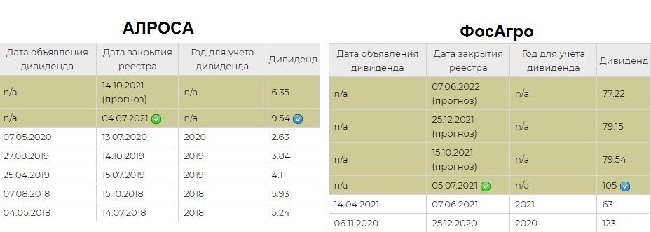 #ALRS #PHOR Ближайшие среда и четверг (30 июня и 1 июля) — последние дни для покупки бумаг АЛРОСА и «ФосАго» соответственно, чтобы получить по ним дивиденды. 💰АЛРОСА выплатит 9,54 рубля на акцию, что соответствует дивдоходности 7,23%. Дата дивидендной отсечки — 2 июля. 💰В свою очередь, «ФосАгро» заплатит инвесторам по 105,00 рублей на одну обыкновенную бумагу. При цене бумаги в 4 816,00 такая выплата дает доходность 2,18%. Дата дивидендной отсечки — понедельник, 5 июля. Подписывайтесь на канал, тут будет много интересного про инвестиции и пассивный доход.