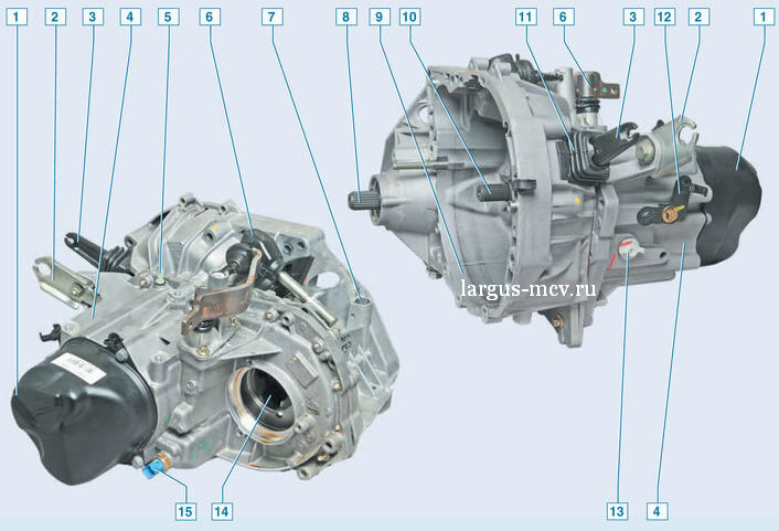 Коробка передач JH3: 1 - задняя крышка кпп; 2 - кронштейн троса сцепления; 3 - вилка сцепления; 4 - картер кпп; 5 - штуцер сапуна; 6 - механизм переключения передач; 7 - полость для датчика скорости; 8 - вал правой полуосевой шестерни дифференциала; 9 - картер сцепления; 10 - первичный вал; 11 - пыльник; 12 - держатель для электропроводов; 13 - крышка маслозаливная; 14 - корпус внутреннего шарнира приводного механизма левого колеса; 15 - выключатель света заднего хода