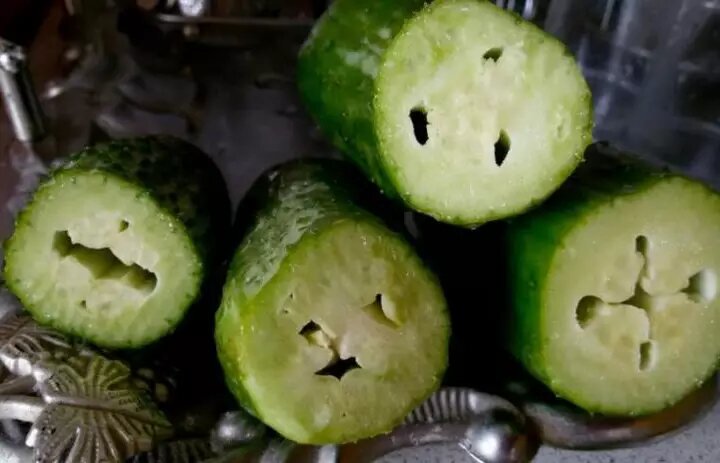Пустоты в огурцах - всегда печальное зрелище. Такие огурчики не годятся в консервацию и в свежем виде плохо хранятся. Мы знаем три главные причины, а главное лечение этой неприятности и расскажем вам! НАРУШЕННОЕ ПИТАНИЕ "Дыры" в огурцах часто появляются при избытке азота и нехватке фосфора и калия. Определить это просто. При дефиците калия на листьях огурцов появляется желтая сухая кайма, "краевой ожог", а огурчики становятся грушевидными. На фото ниже пример того, что можно обнаружить Избыток азота в почве часто бывает при теплой и влажной погоде, а также при подкормках настоями травы, навоза и куриного помета Лечение Калимагнезия содержит еще и магний очень необходимый растениям для нормального фотосинтеза и формирования плодов. Подкормку проводить каждые 10-14 дней, поливом по слегка влажной почве ПРОБЛЕМЫ С ПОЛИВОМ Недостаточный и неравномерный, редкий обильный полив могут приводить к появлению пустот.