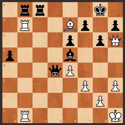 Предлагаю Вашему вниманию фрагмент партии Пономарев - Шипов, 1998 год. Позиция белых кажется проигранной. Черные просто надвигают пешку а5, и скоро выиграют. Но белые начинают и получают перевес. Подписывайтесь на канал, будут новые интересные статьи. Как получить перевес за белых смотрите далее. 1. Белые ставят слона на f6, грозит элементарный мат. 1. .................. черные забирают белого слона. 2. Белые бьют черную ладью и остаются с ладьей против слона и пешки. Получают перевес, хоть и небольшой. Следующая задача тут>>>>