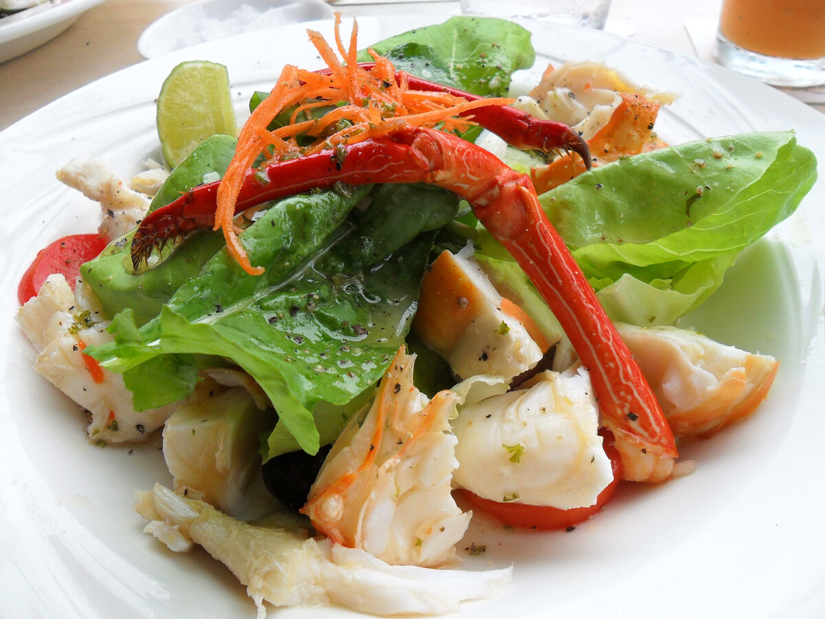 Крабы 50, Яйца 20, Салат зеленый 30, Морковь 15, Картофель 30, Цветная капуста или яблоки 25, Зелёный горошек или стручки фасоли 5, Помидоры 20, Заправка салатная 15, Майонез 40, Маслины 10. Добрый день, дорогие друзья! Сегодня делюсь рецептом салата из крабов. Консервированные крабы замариновать в течение нескольких минут в салатной заправке (смешанные растительное масло, уксус, соль, сахар и молотый перец). На середину салатника или вазочки положить горкой нарезанный заправленный и зеленый салат или смесь овощей, нарезанных кубиками (1/3 всего количества) и заправленных майонезом, а на них крабы. Вокруг горки уложить гарнир букетами: кружки яиц и варёной моркови, кочешки вареной цветной капусты или ломтики яблок, зеленый горошек или стручки фасоли, помидоры и зеленый салат. Гарнир заправить салатной заправкой. Украсить салат ломтиками яблок, маслинами или нарезанными дольками чернослива. Соус майонез подать отдельно. Так же можно приготовить салат из раков (очищенных шеек и клешней