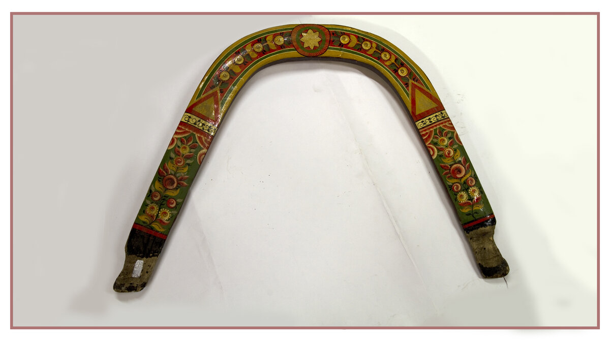 Деревянная дуга являлась одной из основных частей русской конной упряжи. Главное назначение дуги состояло в том, чтобы амортизировать толчки при езде по ухабистым российским дорогам: удары повозки о препятствия смягчался благодаря тому, что гужи – кожаные петли, соединяющие дугу, хомут и оглобли, – растягивались, а дуга изгибалась. Для изготовления дуг использовали чаще всего древесину вяза, отличающуюся твердостью и прочностью, и вербы – мягкой, легкой и упругой. При изготовлении дуги деревянную заготовку сгибали подобно луку. Это требовало силы, умения и терпения, о чем упоминает И.А. Крылов в басне «Трудолюбивый медведь». Дуги для праздничной упряжи украшали резьбой и росписью. Расписные дуги сначала просто делали золочеными, затем стали изображать красные розаны и синие грозди винограда, а еще позже рисовали натуралистические букеты цветов, а также травы и виноград. Дуга была удобным местом для подвески колокольчика. Для этого на середине внутренней части дуги крепили металлическую