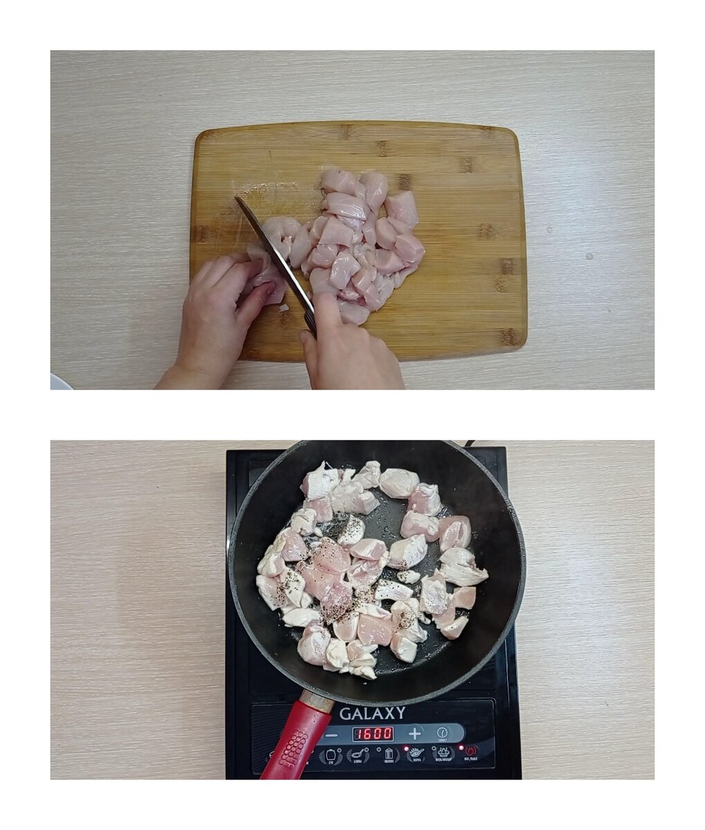 Здравствуйте, уважаемые читатели! Сегодня предлагаю вам очень вкусный рецепт жаркого в духовке, я готовлю его без горшочков. Получается не хуже однозначно, блюдо такое же нежное, сочное и ароматное! В этот раз я использовала в качестве начинки новый для себя состав. Итак, для приготовления понадобится куриное филе или любое мясо, которое вы любите. Филе нарезать небольшими кусочками и обжарить на сковороде. Специи добавить по вкусу, я использовала соль и перец. Далее к обжаренному филе добавить лук И натертую морковь. Перемешать и тушить несколько минут. Пока тушится мясо с луком и морковью, промываем чернослив и реже на небольшие полоски. Затем добавляем к мясу. Чернослив с мясом тушим около 5 минут и добавляем ложку муки. Хорошо перемешать, залить горячей водой. Теперь все ингредиенты на месте, закрываем крышкой и оставляем на медленном огне на 10-15 минут. Картофель порезать на кусочки, добавить специи и перемешать. От фольги отрезать лист длиной примерно 30 сантиметров