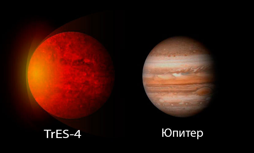 Вокруг родительской звезды планета совершает оборот за 3,5 дня, а атмосфера гиганта разогревается до 1500 градусов Цельсия. Диаметр TrES-4 A b составляет 257 230 километров против 139 820 километров диаметра Юпитера. Однако, что очень интересно, масса TrES-4 A b на 8% меньше массы Юпитера. Как же так?