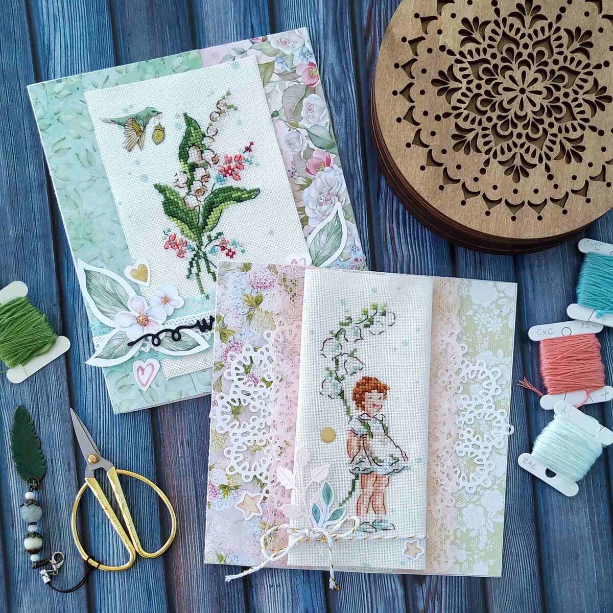 Когда я получила книгу Французская вышивка "Праздники Франции" Вероник Ажинер мне оттуда понравилось сразу много сюжетов и сюжетико! Но в оформлении интерьера я их совершенно не вижу! Различные прикладухи: полотенчики, салфетки и т.п. с вышивкой я не использую. А вышивать просто в стол не хотелось! И тут я вспомнила, что я же немного скрапбукер) Ну как немного, я несколько лет плотно этим увлекалось и даже не вышивала тогда. А потом вышивка меня поглотила) Но по "бумажкам" я скучаю! Иногда все-таки хочется пошуршать, потрогать цветочки, наклеечки, кружавчики! Для справки: Скрапбукинг - это творчество с бумагой: открытки, альбомы, конверты, календарики и т.п. В итоге вышивка двух сюжетов быстро оформилась в две открыточки. Одну я подарила учительницы моего старшего сына, на окончание года. Он окончил первый класс. И с учительницей, я считаю. нам очень повезло! А вторая открытка для няни моих деток. Она проработала у нас два года и, к сожалению, уехала в другой город. Но мы очень сблиз