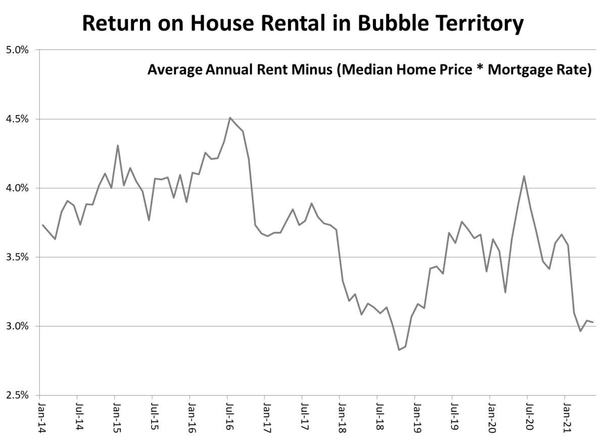 Определение пузыря: вы покупаете финансовый актив, ожидая, что он ничего не заработает, но надеетесь продать большему дураку, чем вы сами, который заберет его у вас из рук по более высокой цене. Президент ФРС Бостона Эрик Розенгрен предупредил в понедельник, что Соединенные Штаты не могут позволить себе еще один «цикл подъема и спада» в жилищном секторе. После того, как Национальная ассоциация риэлторов на прошлой неделе сообщила о рекордном 24%-ном скачке средней цены продажи жилья в США в период с мая 2020-го года по май 2021-го года, трудно рассматривать рынок жилья как что-либо, кроме зарождающегося спада. Корпоративная Америка считает, что аренда дома – самая выгодная инвестиция. На прошлой неделе Blackstone заплатила 6 миллиардов долларов за приобретение Home Partners of America, но, и другие институциональные инвесторы вкладываются вместе с ней в подобные активы. Примечательно, что инвесторы платят большие деньги за дома на одну семью с нулевой ожидаемой доходностью. Это не мож
