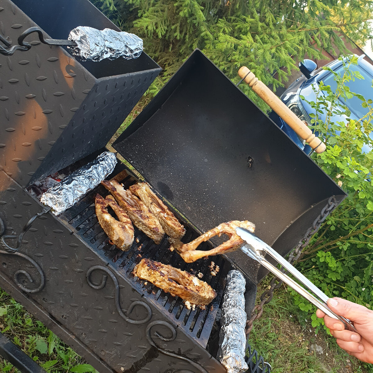 Приехала я к родителям и мы решили приготовить вкусняшку. Папа у меня рыбак, поэтому проблем с рыбой не было, решили приготовить леща. А муж сестры прекрасный повар, постоянно что-то придумывает 😋 вкусненькое) Хочу отметить, что место для отдыха сделано его руками. Картошка: Нарезать пластиками и чередовать на шампур с беконом, посолить, поперчить и завернуть в фольгу. Рыба: Порезать на стейки, посолить, поперчить, добавить специй ... И обязательно соевый соус. Запах речной рыбы 🐟 сразу пропадает. Рыба должна промариноваться минимум 1 час, потом обжариваем на мангале до готовности, примерно минут 20. И вкусный ужин готов )))) . Приятного аппетита 😋😋😋