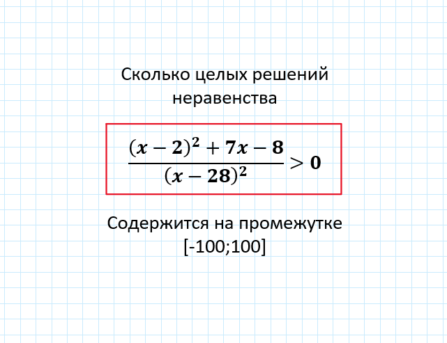 Здравствуйте, дорогие читатели. Предлагаю Вам сегодня разобрать интересное задание на решение неравенства. Подвох заключается в том, что нам нужно не только решить неравенство, но и определить какое количество его целых решений содержится в определенном промежутке. Полный текст задания представлен на картинке: Если Вы найдете способ проще, чем тот, который будет изложен ниже, то буду рада увидеть его в комментариях! Сразу заметим, что в знаменателе всегда будет положительное число, т.к. там содержится квадрат выражения и знаменатель не может равняться нулю. Так как вся левая часть должна быть положительной, то числитель и знаменатель обязаны быть одинакового знака. Следовательно, мы можем записать ОДЗ и далее рассматривать только упрощенное неравенство: числитель больше нуля. Теперь поработаем над упрощением числителя, для этого раскроем квадрат разности и приведем подобные: Будем решать методом интервалов, поэтому, по теореме Виета находим корни квадратного уравнения: Отмечаем эти точ