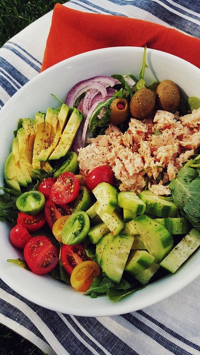 - Режем, то что режется : авокадо кубиками, помидорки пополам, огурец тоже кубиками, яйцо режу на половинки и ещё раз каждую пополам,лук полукольцами.
