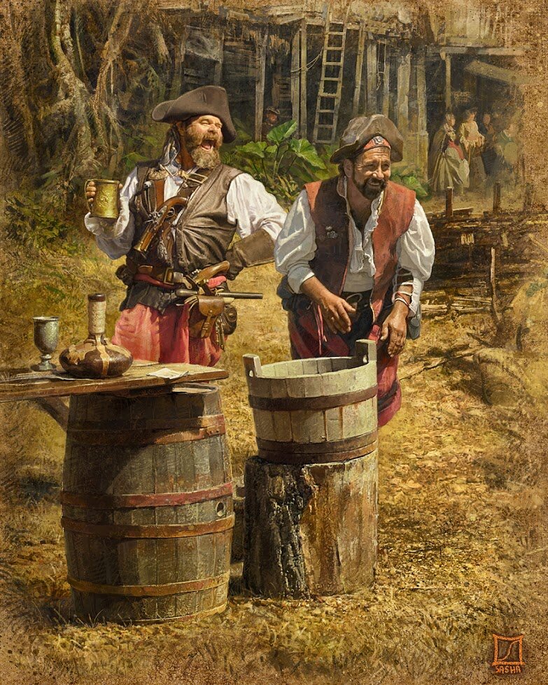 С 1530 по 1550г. на Больших Антильских островах Карибского моря- Ямайке, Кубе,Гаити, очень многое изменилось. Простой люд и плантаторы покидали эти земли , в поисках своего счастья на Материке, в Мексике и Перу. Эти опустевшие земли стали занимать те, от кого удача как раз отвернулась на Большой Земле - должники, не способные рассчитаться с кредиторами, дезертиры, обанкротившиеся торговцы, беглые рабы и конечно же авантюристы Эти люди объединялись по двое, по трое и начинали вести совместное хозяйство. У них были слуги и собаки, от 20 до 30, приученных к охоте. Основным промыслом была охота на буйволов и одичавших домашних животных, которых бросили прежние хозяева этих земель. Из убитых лошадей вытапливали лампадное масло, а из мяса заготавливали солонину. Вот как раз последний процесс приготовления мяса происходил на специальной решетки, которые индейцы называли -"букан". Отсюда и пошло название этих людей - буканьеры, которые к сожалению вскоре сами превратились в безжалостных пира