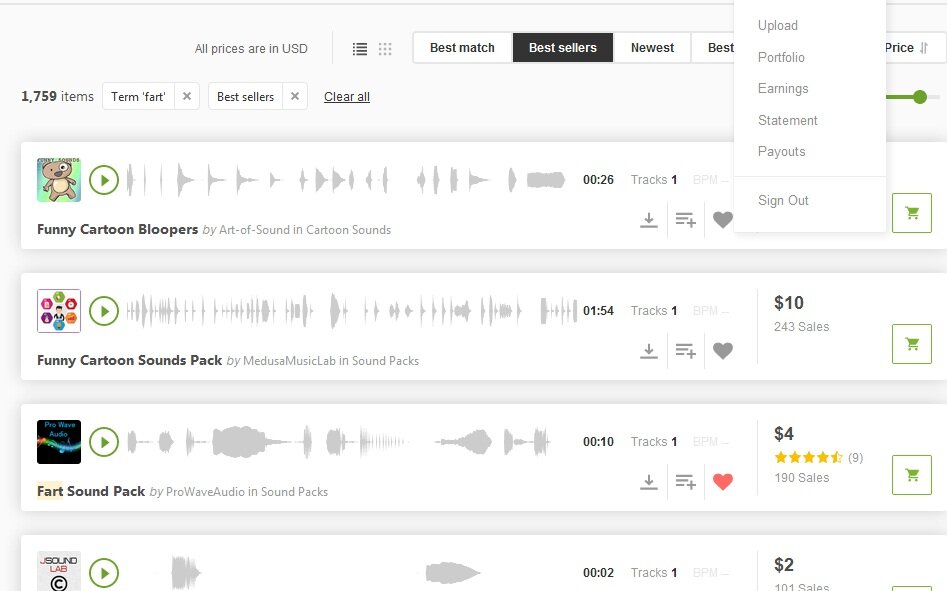 Я помню, как мы смеялись с того, что кто-то нашел там аккаунт, на котором человек продал только звук пукания на свыше чем 8000 долларов - то есть его звук-сэмпл за пару долларов просто скачали несколько тысяч раз, разные заказчики.