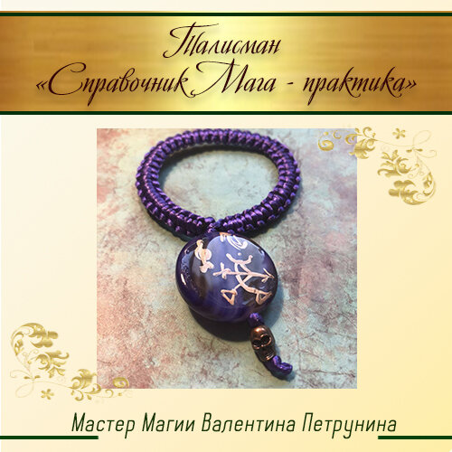 Талисман предназначен только для практической работы. После работы его следует убрать. Для получения информации талисман берут в левую руку. Если нужно совершить воздействие – в правую. Браслет – петля служит для усиления связи с талисманом, а также для удобства и фиксации талисмана в руке. Во время практической работы ее следует надеть на ладонь, поместив Артефакт в ее центр и сжать пальцы в кулак.