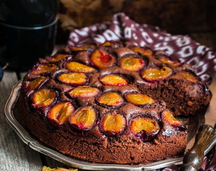 Этот пирог насыщенно шоколадный, сливы добавляют ему сочности. Вместо слив, можно использовать любые спелые фрукты, нарезанные дольками. Он отлично подойдет для чаепития в семейном кругу или для угощения гостей. И так, нам понадобятся Ингредиенты: Приготовление: 1. Разогреваем духовку до 180°С. Форму для выпекания смажем растительным маслом. 2. Сливы разрезать пополам и удалите косточку. 3. В небольшую миску просеиваем муку с разрыхлителем, добавляем ванилин, соль и все тщательно перемешиваем. 4. Отдельно соединяем размягченное сливочное масло с двумя видами сахара. Взбиваем до светлого цвета и кремообразного состояния. 5. Добавляем какао-порошок, взбиваем венчиком. 6. Затем добавляем яйцо и снова хорошо взбиваем до однородного состояния. 7. Добавляем треть муки и перемешиваем до однородности. 8. Затем по очереди добавляем половину молока, половину оставшейся муки, перемешиваем. Затем оставшееся молоко и оставшуюся муку. Опять тщательно перемешиваем до однородного состояния. 9. Пере