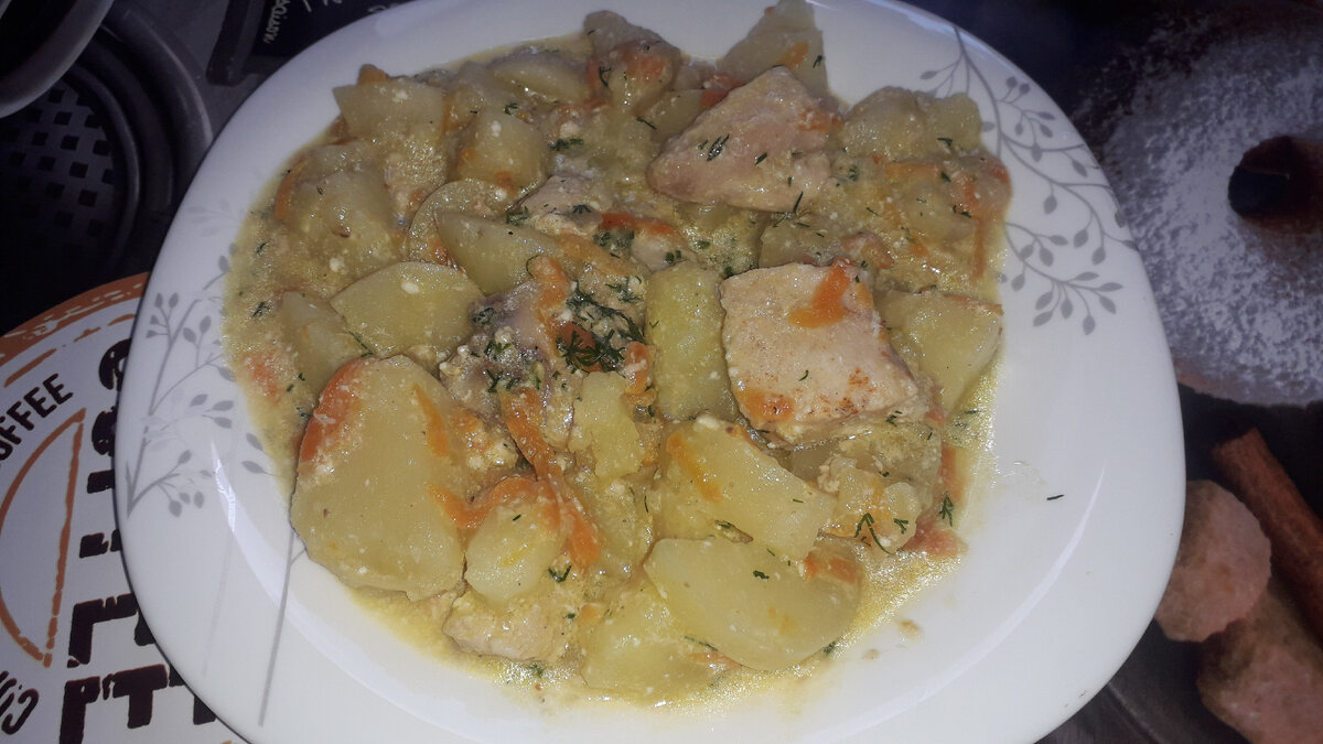Вы решили приготовить сытный,вкусный и нежный ужин,чтобы порадовать всю свою семью?В этом случае вам будет полезно знать,как приготовить картошку с курицей в сметане.Блюдо получается изумительно вкусным и нежным. Ингредиенты: куриная грудка- 300-400 гр.,картофель-600 гр.,лук-1 шт.,морковь-1 шт.,вода- примерно 200 мл.,сметана-3 ст. л.,масло сливочное-30 гр.,укроп-7-8 веточек,соль,перец,приправа для курицы- по вкусу.,1 зубчик чеснока. Морковь вымыть,очистить и натереть на терке. Лук очистить и мелко нарезать. Куриную грудку нарезать на порционные кусочки. Картофель вымыть,очистить и нарезать. В сковороде разогреть растительное масло, выложить лук,немного посолить и обжарить до мягкости. Добавить морковь и обжарить вместе еще несколько минут,чтобы морковь обмякла. Сверху,на овощи,уложить кусочки мяса и немного посолить,добавить перец и приправы. На курицу выложить картофель и немного посолить.Сверху положить 3 ст.л. сметаны и кусочек сливочного масла.Все залить водой не доходя до верхнег