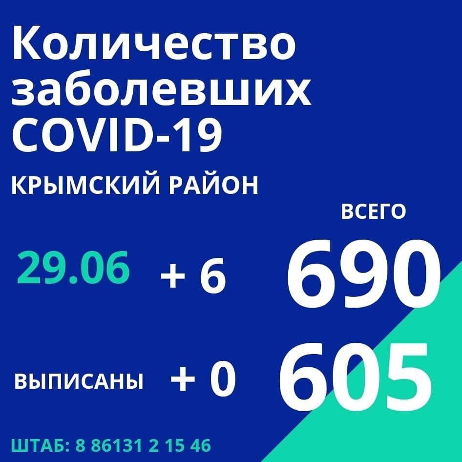 ⠀ 29 июня по информации оперативного штаба Краснодарского края в Крымском районе 6 новых случаев заражения коронавирусной инфекцией. По официальной статистике - у нас в районе за все время зарегистрировано 690 заболевших.⠀⠀ ⠀⠀ В провизорном госпитале города Крымска проходит лечение 246 пациента из шести районов края, 15 находятся в палатах интенсивной терапии, 2 - на аппаратах ИВЛ. ⠀ ⠀⠀ Уважаемые жители Крымского района! Обязательно носите маски, перчатки в общественных местах, чаще мойте руки, используйте специальные средства для дезинфекции.⠀⠀ ⠀⠀ Берегите себя, своих детей и родных, особенно пожилого возраста, имеющих хронические заболевания.⠀ ⠀⠀ Если у вас появились признаки ОРВИ, не нужно ехать в поликлинику, вызовите врача на дом:⠀⠀ ⠀⠀ 8 86131 4 51 00⠀⠀ ⠀⠀ Если у вас поднялась температура выше 38.5 градусов - вызовите скорую медицинскую помощь:⠀⠀ ⠀⠀ 03, 103⠀⠀ ⠀⠀ Берегите себя и своих близких!⠀⠀ ⠀⠀ #коронавирусунет #крымск#крымскийрайон#кубань⠀;