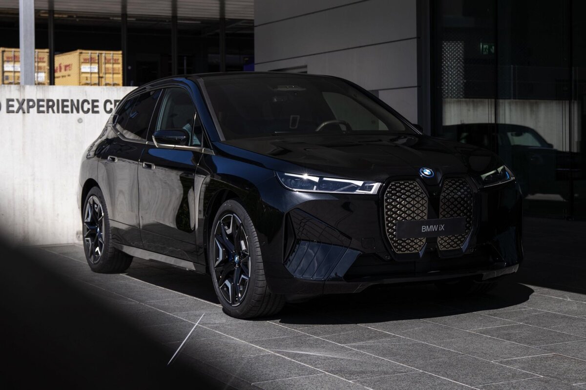 На фото представлена топ-модель BMW iX xDrive50 со спортивным пакетом и лакокрасочным покрытием в сапфирово-черном цвете металлик.Большие аэродинамические диски Inch 1020 Bicolor с 3D полировкой. Со стороны средней стойки затемненные стекла солнцезащитного остекления завершают мрачный вид. Титановая бронза BMW Individual Exterior Line практически единолично отвечает за несколько цветных акцентов на почти полностью черном BMW iX: линия дизайна обеспечивает не только элегантный бронзовый акцент на нижнем крае оконной линии, но и в обрамлении окон. Рисунок решетки радиатора BMW с датчиками и логотип модели xDrive50 на задней панели выполнены из титановой бронзы. Цветовая гамма в салоне BMW iX намного удобнее и светлее: дизайн интерьера Loft Stonegrey и внутренние приложения Clear & Bold вместе создают стильную атмосферу высокого качества. Пакет Clear & Bold включает в себя переключатели и органы управления из настоящего хрусталя, декоративные элементы из дерева с открытыми порами, сертиф