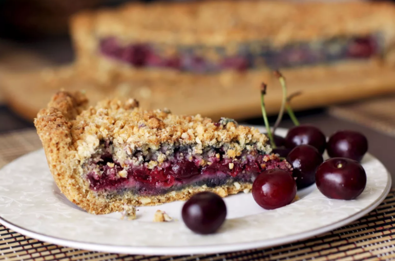 Половину теста вложить на противень так,чтобы получились ещё бортики. На тесто выкладываем начинку. Сверху закрываем полосками из ставшегося теста. Минут 10 пирог должен ещё постоять, отдохнуть. Смазываем сверху взбитым сырым яйцом. Затем выпекаем до готовности, до румяной корочки.