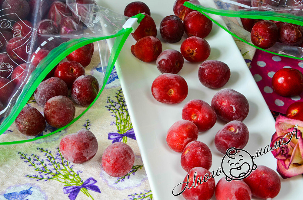 Только после того, как черешня промерзла, ее можно пересыпать в порционные пакеты или емкости для дальнейшего хранения. Очень удобны в этом плане пакеты с пластиковым замком-молнией.