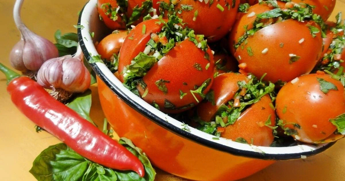ИНГРИДИЕНТЫ: Ставьте лайк "палец вверх", если любишь вкусно покушать и подпишись на канал, чтобы не пропускать лёгкие и вкусные рецепты Приготовление: Берём наши помидорки разрезаем их на 4 части не до конца. Нарезаем мелко петрушку с укропом и добавляем к помидорам. Пропускаем чеснок через чеснокодавку и добавляем. Мелко нарезаем острый чили и высыпаем. А так же добавляем соль, сахар, винный уксус.