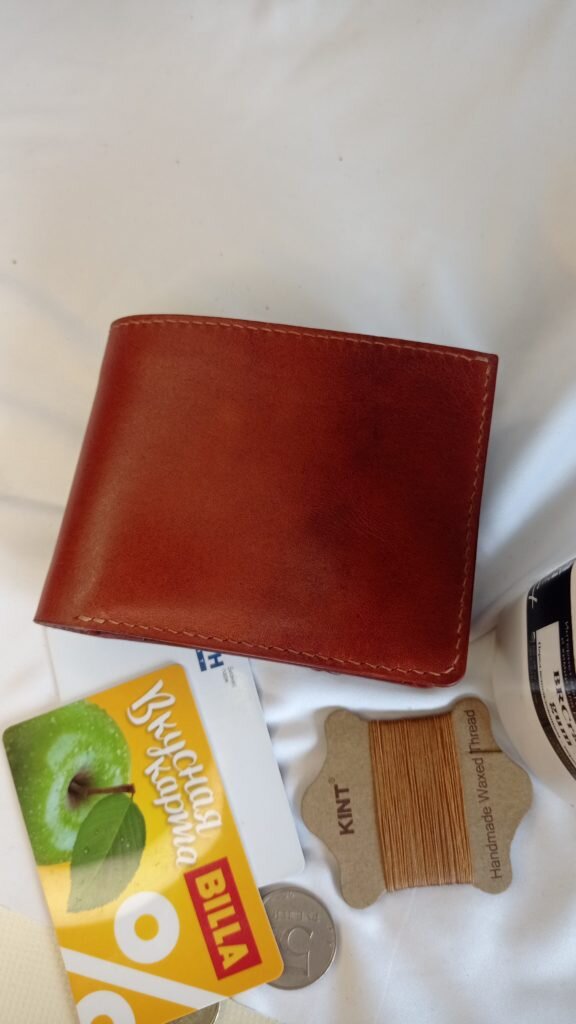 Около года назад в одном из сообществ «Пикабу» увидел пост от пользователя netlogina, где и разжился выкройкой этого бифолда (кошелёк двойного сложения). Раскроил детали по выкройке, кожа VIP (артикул из Тавро), растительного дубления с лицевым покрытием. Достаточно плотная, толщина около 1,4 мм. Нить «Kint» круглая кручёная 0,4 мм, пробойник 3,85 с косым зубом. Так как процесс растянулся на несколько месяцев (основная работа, другие дела и прочее), то закончить получилось только сейчас. Фотографии процесса где-то есть, но, честно говоря, искать лень. Внутри бахтарма заглажена с помощью коричнего Токонола, часть урезов обработана им же. Основные урезы обработал средством, что на фото, а сверху «закрыл» (не нравится мне выражение «вскрыл») воском Коламбус. По вышеозначенным причинам фото только готового варианта, без процесса.