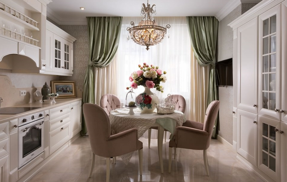 В итоге получилась весьма экстравагантная кухня-столовая с мраморной отделкой, антикварными вазами и дорогим столовым гарнитуром в классическом стиле.
