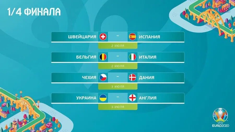 1/8 финала Евро-2020 завершилась, определились пары четвертьфиналистов. Матчи этой стадии принесли несколько ярких неожиданностей и драм. В 1/4 финала, матчи которой пройдут 2 и 3 июля сойдутся следующие команды: 1. Швейцария - Испания (2 июля, Санкт-Петербург) 2. Бельгия - Италия (2 июля, Мюнхен) 3. Чехия - Дания (3 июля, Баку) 4. Украина - Англия (3 июля, Рим) Какие же прогнозы? 1. Швейцария - Испания 1:2 Исходя из итогов 1/8 финала, в матче Швейцария - Испания сложно сказать, кто победит. С одной стороны, крепкая и опытная Швейцария, с другой - весьма яркая, но нестабильная Испания. Но всё же наверно Испания, которая много создаёт моментов, и усвоила урок от Хорватии, а также научится на ошибках Франции. 2. Бельгия - Италия 1:3 тут сойдутся 2 команды с противоположными ценностями. С одной стороны прагматичная Бельгия, с другой играющая техничная Италия. Но скорее итальянцы выбьют бельгийцев, которые потеряли Де Брёйне и Эдена Азара. Усилий одного Лукаку не хватит. 3. Чехия - Дани