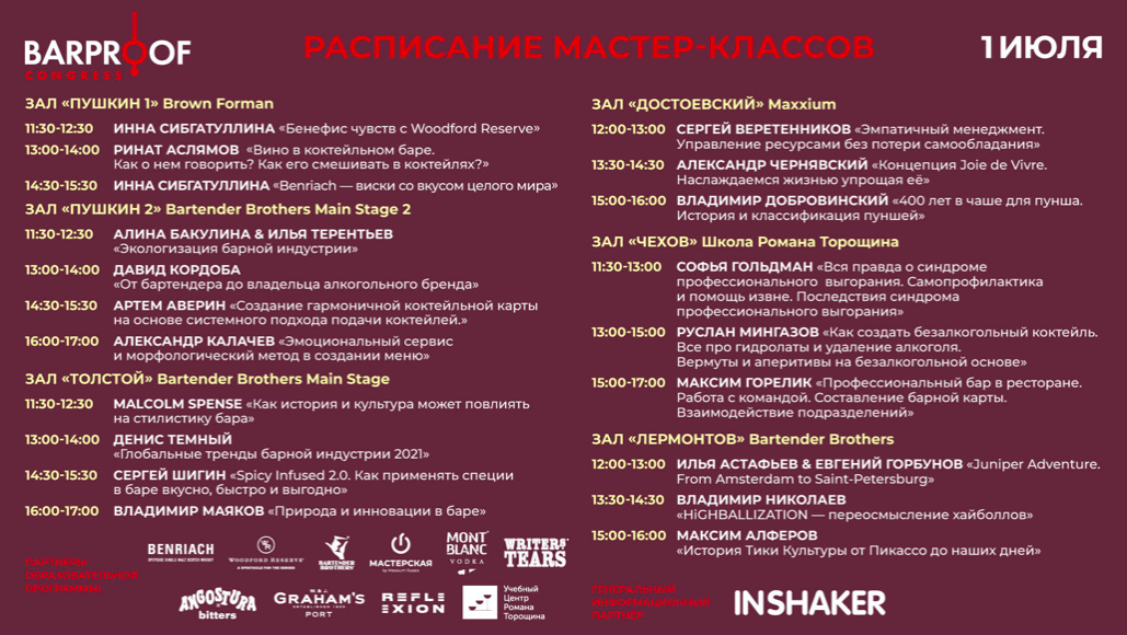 Было бы неправдой сказать, будто бы я знаю всех участников мастер-классов :-), всё-таки я не бармен, но лично от себя рекомендую сходить на лекцию Артура Галайчука (2-е июля, 16:00-17:00, "Пять языков любви. Маркетинг бара").