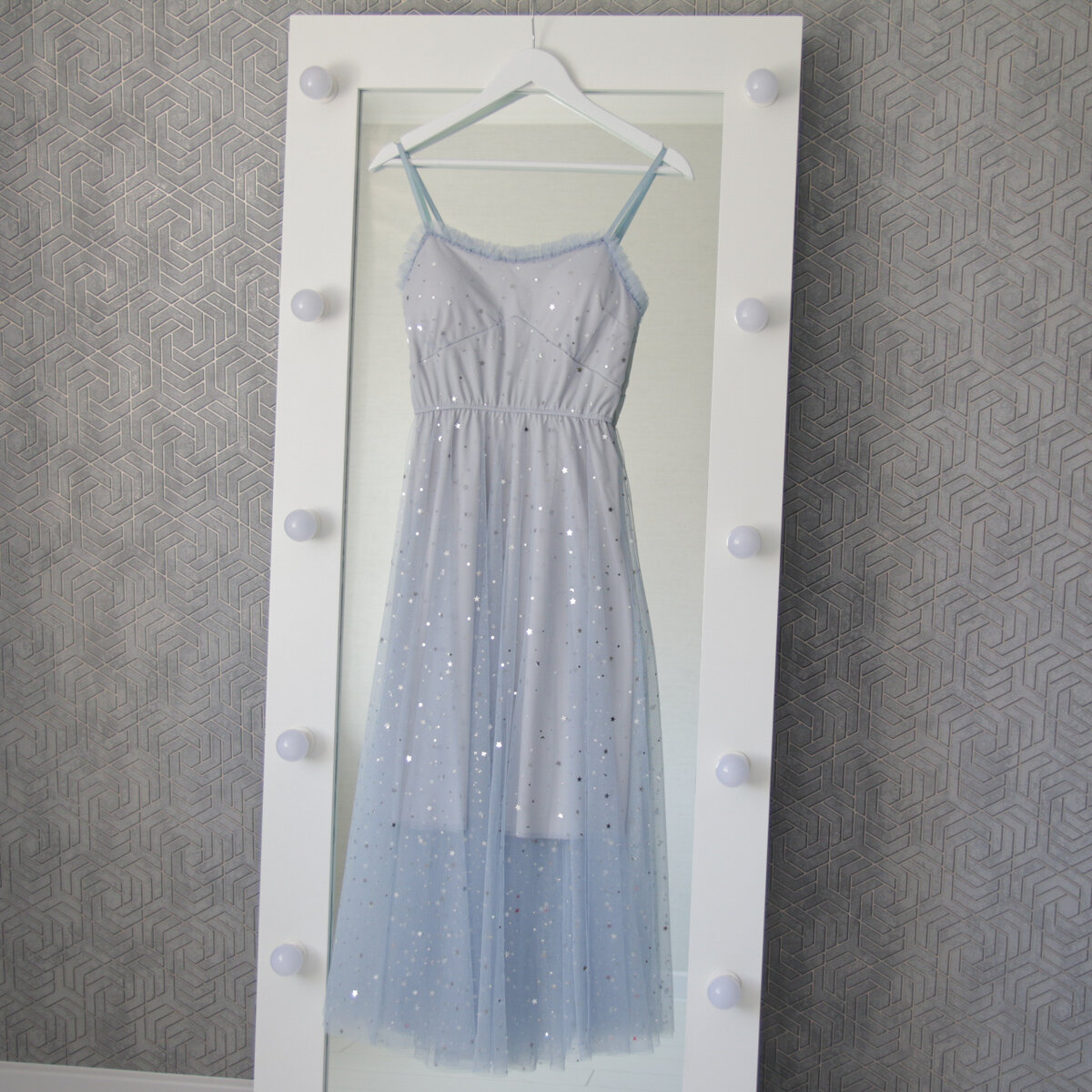 Это красивое платье (ну или, скорее, сарафан) подойдёт, конечно, не на каждый день. В нём можно отправиться на выпускной, отпраздновать день рождения, побывать на свадьбе в качестве подружки невесты. Я в этом платье чувствую себя принцессой. Ну а что? Взрослые девочки тоже иногда хотят почувствовать себя прынцесской 😃 В платье вас заметят издалека, поскольку звёздочки на верхнем полупрозрачном слое сияют при попадании на них света. Ткань будет красиво играть как на солнце, так и при искусственном освещении. Неизвестно, что станет с этими чудными маленькими звёздочками, приклеенными на фатин, после нескольких стирок. Но всё же, девочки, как часто вы носите подобные платья? Раза два в год? Да может, вы вообще наденете его один раз в жизни (на выпускной вечер, например). Платье представлено в 4-х цветах: нежно-розовом, сером, бежевом и чёрном. Я выбрала серый цвет. Продавец почему-то называет его синим. Верхний материал - фатин. Подкладка из приятной на ощупь, тонкой синтетики. Хотелось