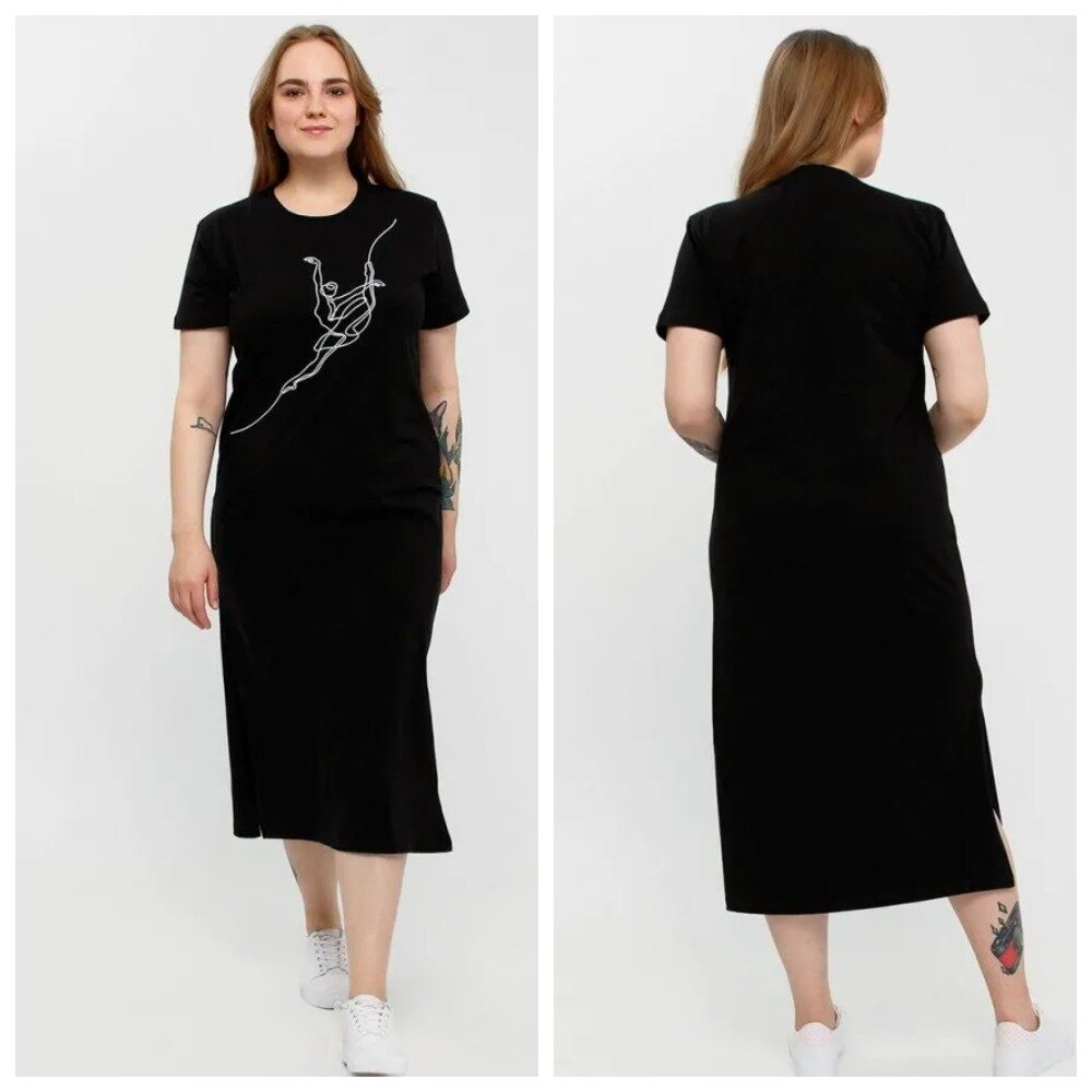 - Простой вариант – платье-футболка из трикотажного полотна, которое хорошо держит форму. Платье черного цвета , украшенное печатным принтом на груди. Модель длиной ниже колена с невысокими разрезами в боковых швах. С таким платьем отлично будут смотреться белые кеды или спортивные сандалии.