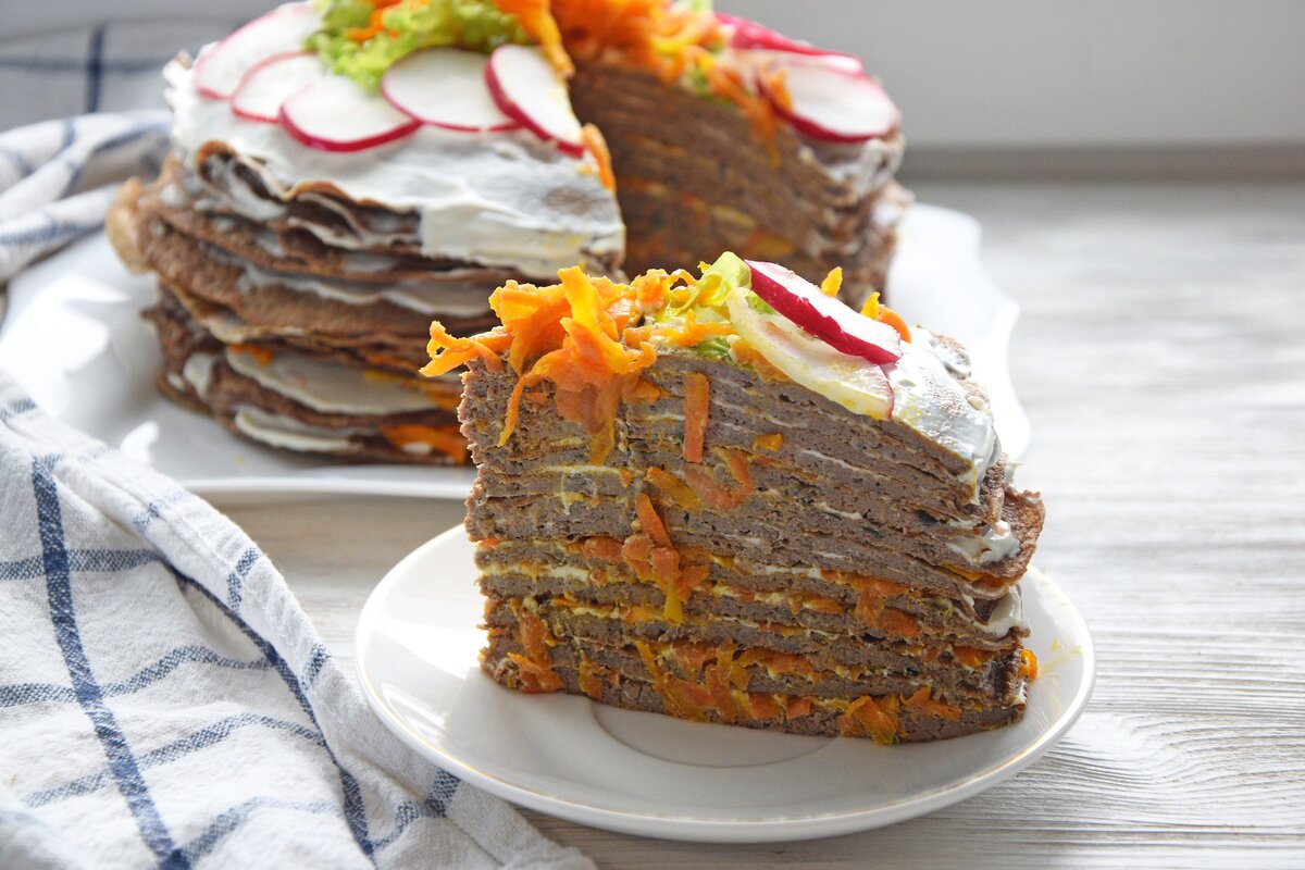 Вкусная и сытная закуска к праздничному столу. Рецепт печёночного торта в домашних условиях