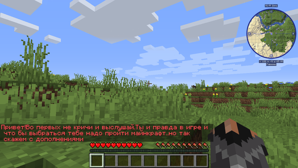 Да он попал в игру..У Оскара закружилась голова и он потерял сознание.Когда он очнулся,открыв глаза он надеялся увидеть свою комнату,но как вы уже поняли он до сих пор был в игре.И тут он увидел странное сообщение в чате. Но кто ты?-Хотел спросить Оскар как невидимка уже отправил 2 послание. Оскар был в полном непонимании-в его голове смешались все мысли,он не понял ничего из слов незнакомца..Он был обескуражен У Оскара закружилась голова и уже через пару минут он знал всё об этом моде)В его руках и правда была книга пока что пустая Далее рассказ ведёться от лица Оскара. Ну чтож в первую очередь я решил построить дом и добыть побольше дерева,рядом я сразу нашёл скелет дракона и каньён.Во время добычи дерева (спавн был хорош) я нашёл храмы горгоны и пустынный.До сих пор я не мог понять как я сюда попал,но опыт подсказывал что сейчас не до раздумий ведь скоро ночь.Быстро сделав маленький домик я скратил деревянную кирку,добыл камень скраффтил меч.Благодаря этому я имел еду и кровать.Быст