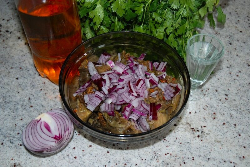 Очень люблю синенькие в любом виде, поэтому хочу показать еще один простой рецепт квашенных синеньких. В таком виде они чаще всего продаются на рынках, у нас по крайней мере. Готовить очень просто. С начинкой тоже возможны вариации, можно сделать острее или наоборот острый перец заменить сладким. Главное перед подачей на стол тонко нашинковать лук в порезанные кубиками баклажаны и полить душистым, колхозным, подсолнечным маслом. Знатная закуска!)) Раствор соли 5%, 50 грамм на 1 литр холодной воды. Баклажаны помыть, отрезать хвостики, бланшировать в кипящей воде 2-4 минуты, вынуть из воды, остудить. Сделать начинку, для этого в отдельную посуду мелко нашинковать зеленую кинзу, кто не любит кинзу, можно петрушку, укроп, сельдерей, мелко нарезать острый перец, выдавить чеснок, все по вкусу. Баклажаны разрезать вдоль, но не до конца, набить разрез приготовленной смесью, опять сомкнуть две половинки, можно перевязать поперек веточкой сельдерея или петрушки (я не перевязывал), Уложить слоями
